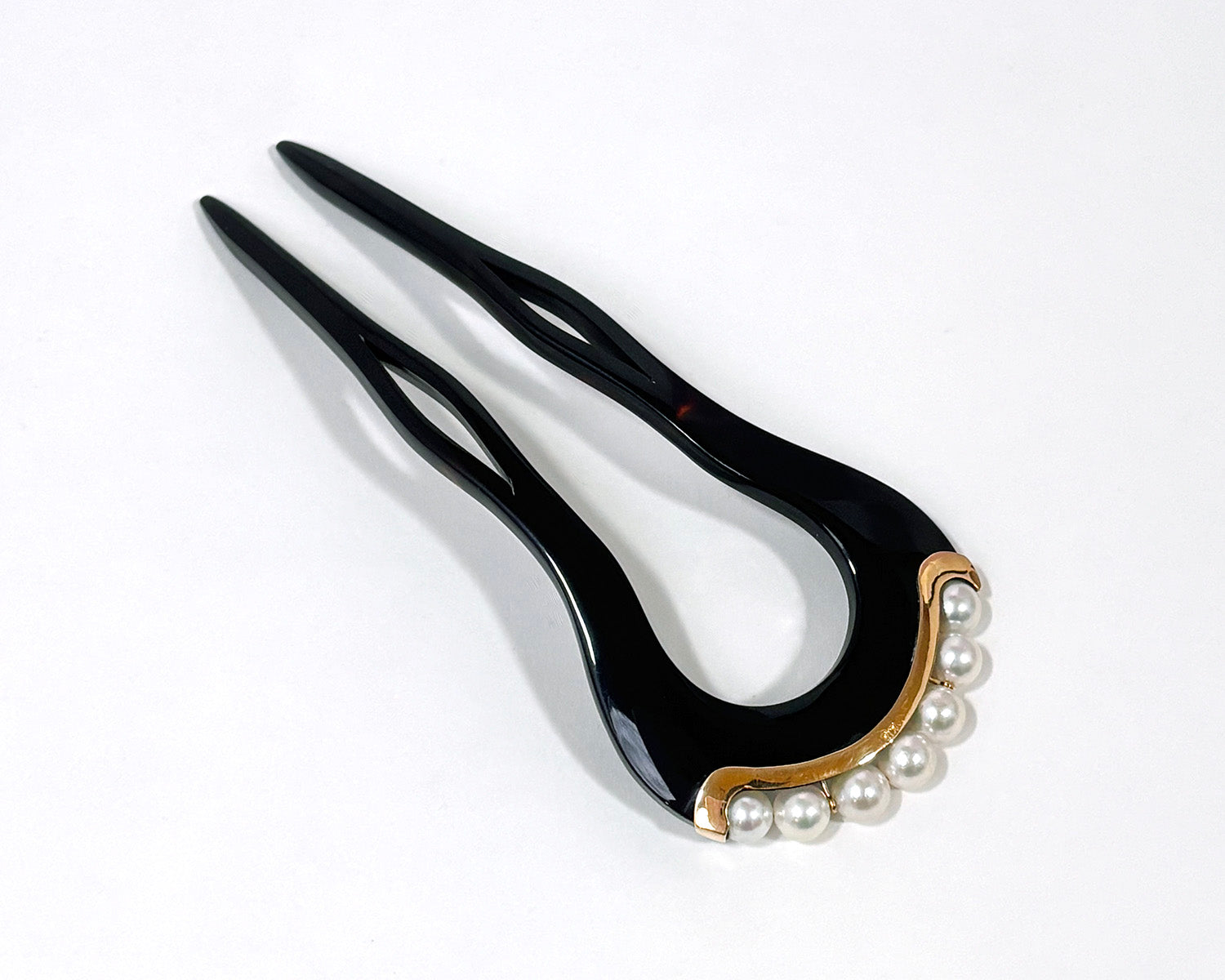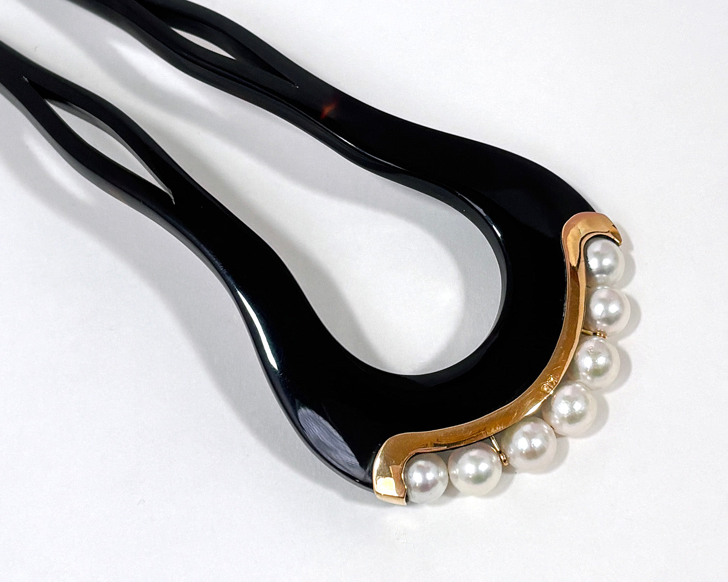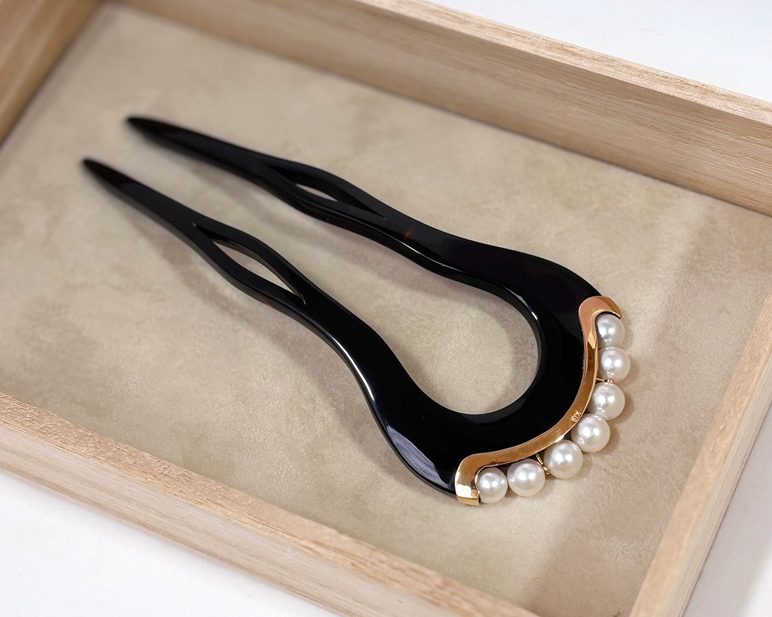 黒べっ甲のかんざしの曲線に沿って配されたパールに18金のプレートが、気品に華やかな彩りをプラスしてくれます。