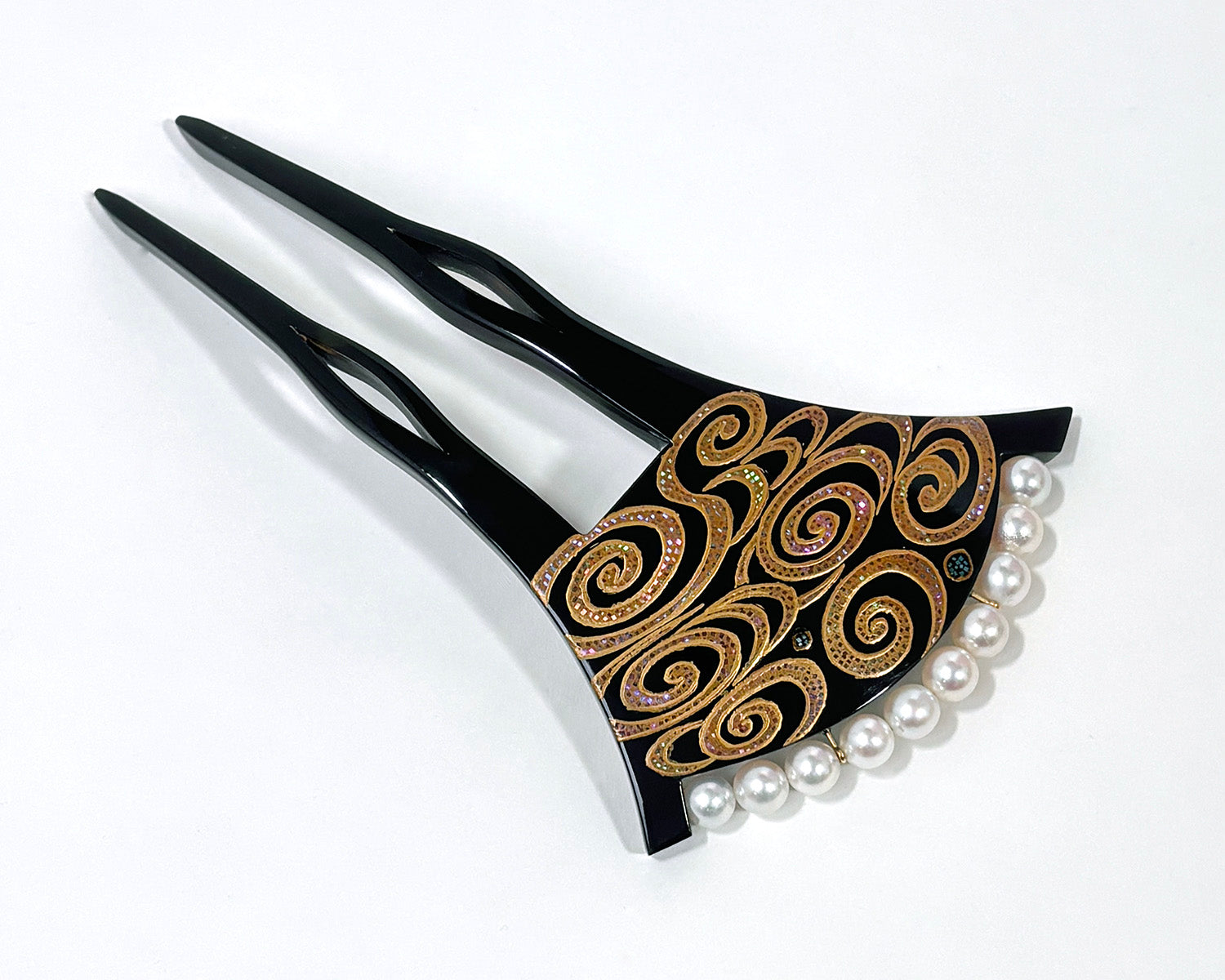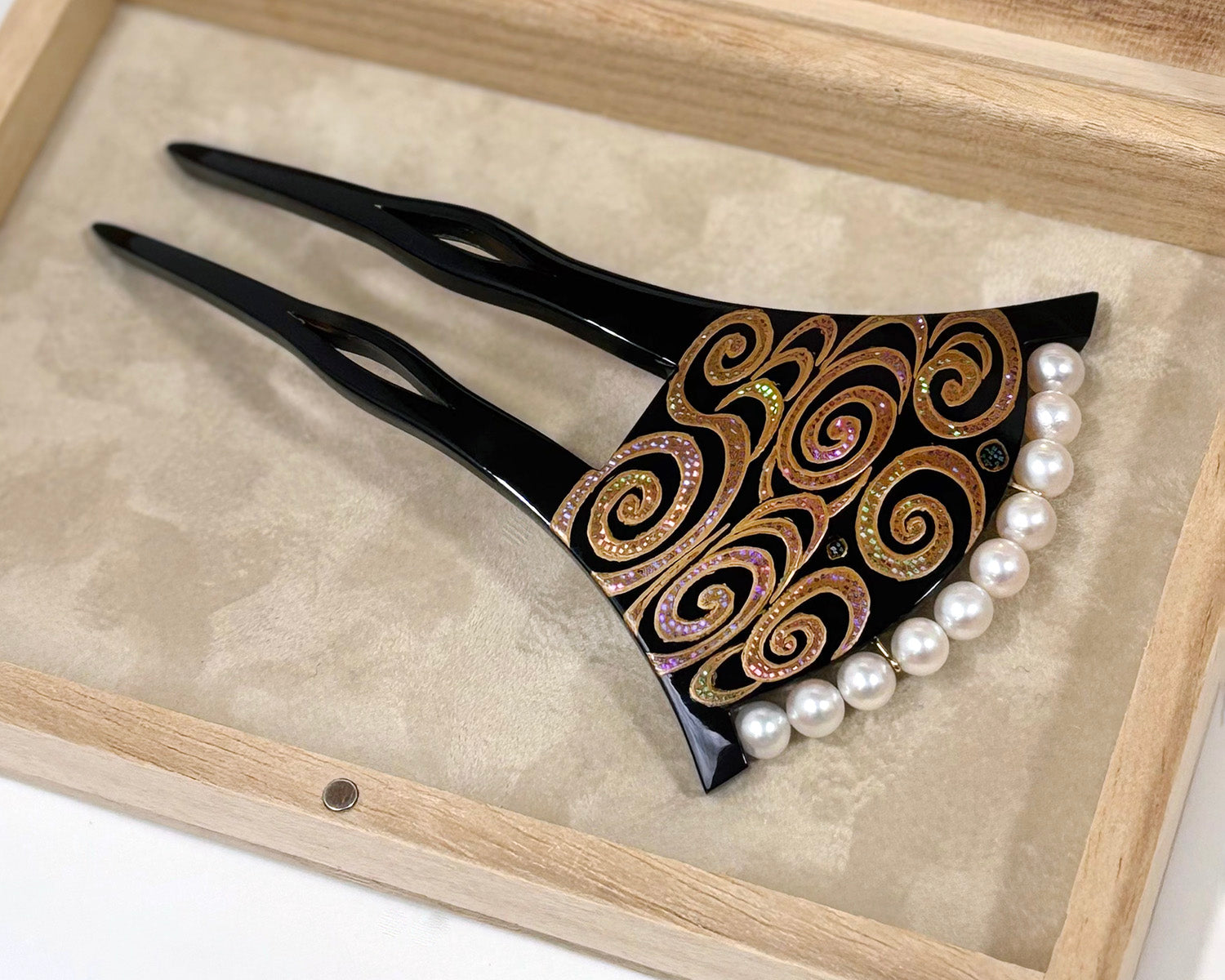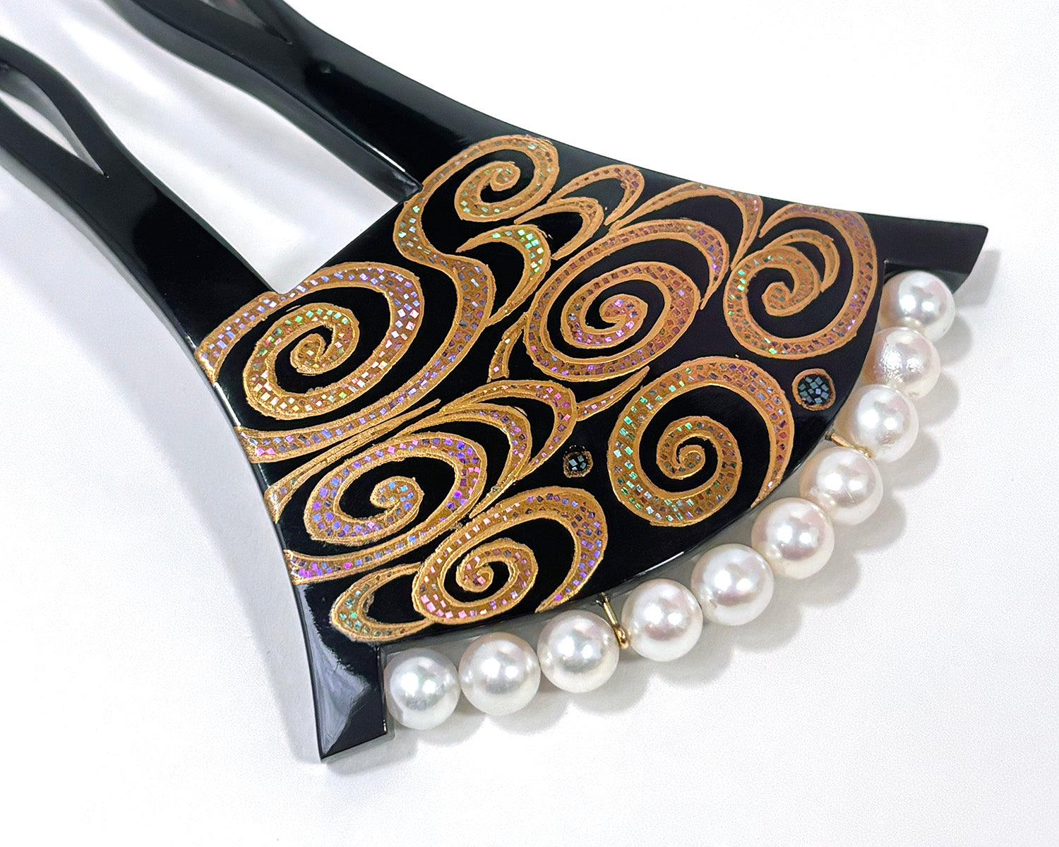 黒べっ甲のかんざしの曲線に沿って配されたパールに18金のプレートが、気品に華やかな彩りをプラスしてくれます。
