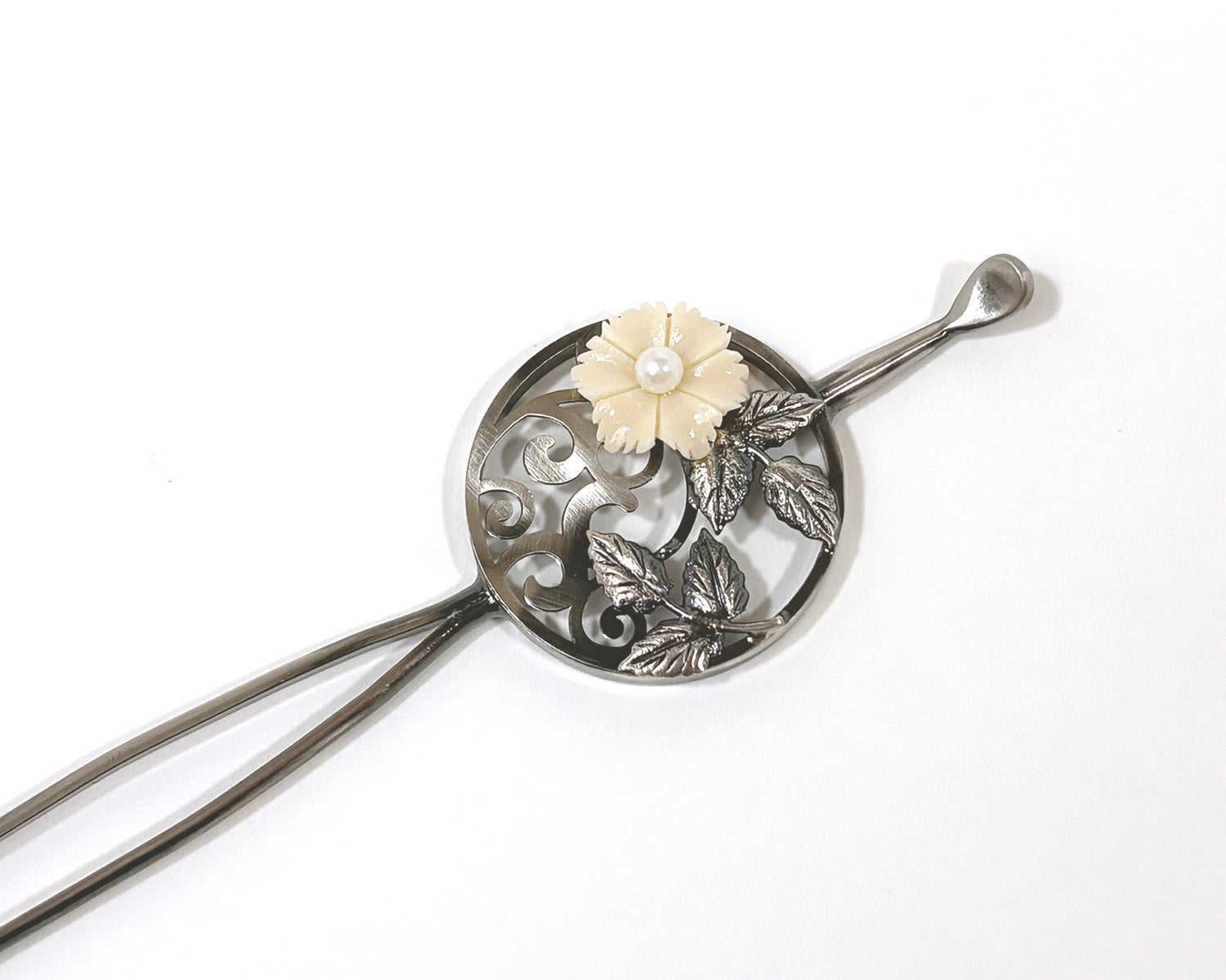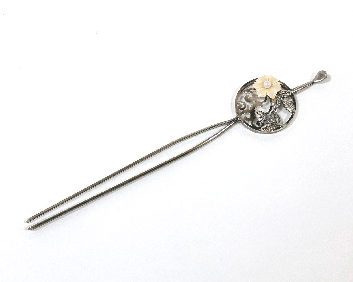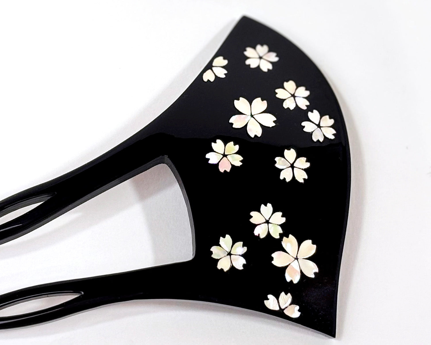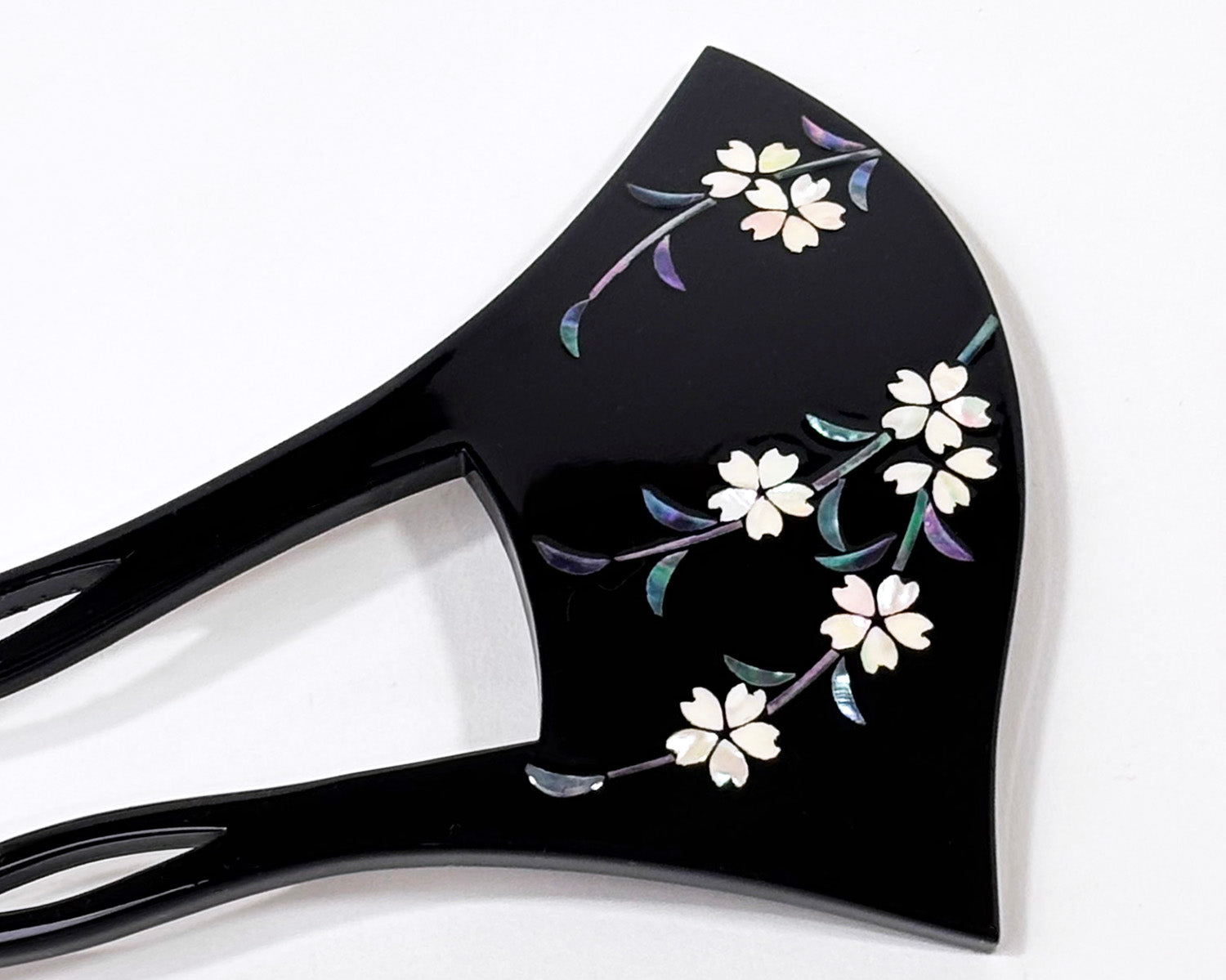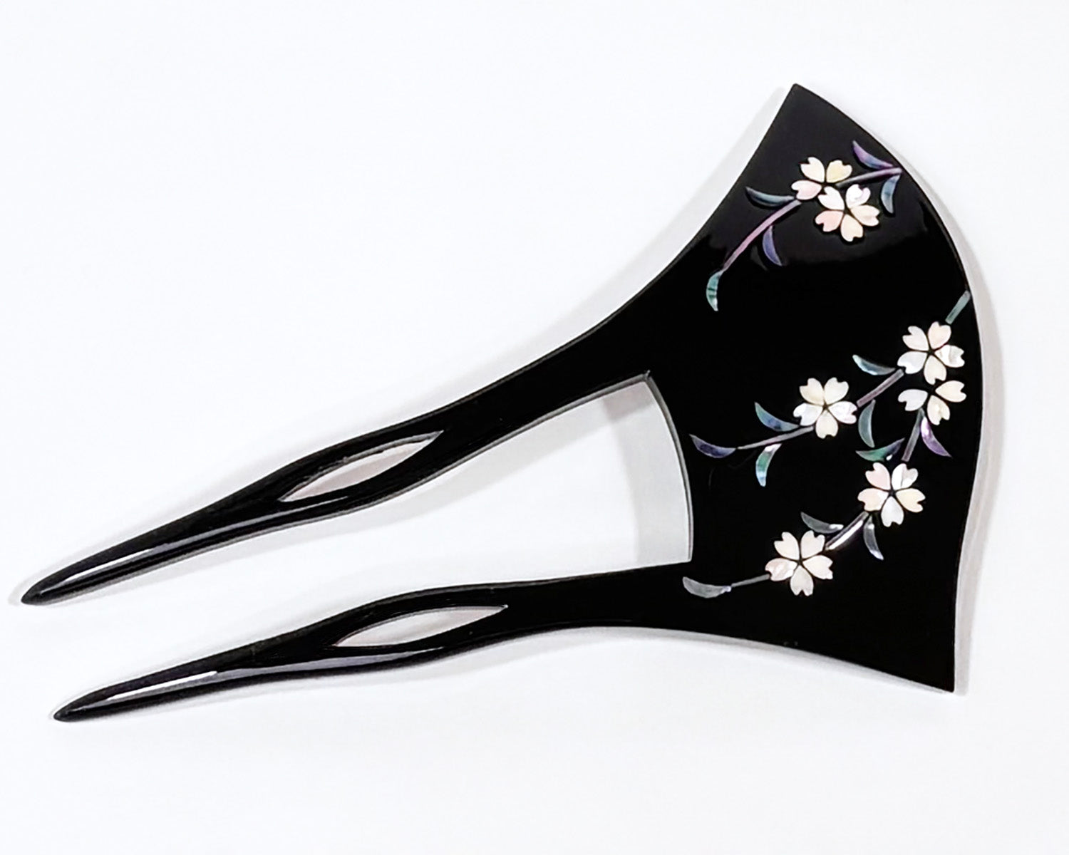 漆黒の艶やかなべっ甲地に、繊細な螺鈿の蒔絵が美しく映えるかんざし。