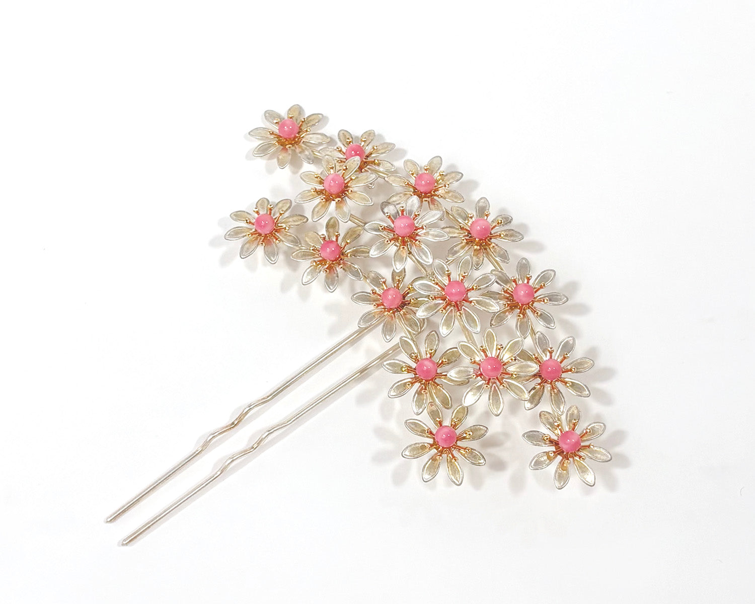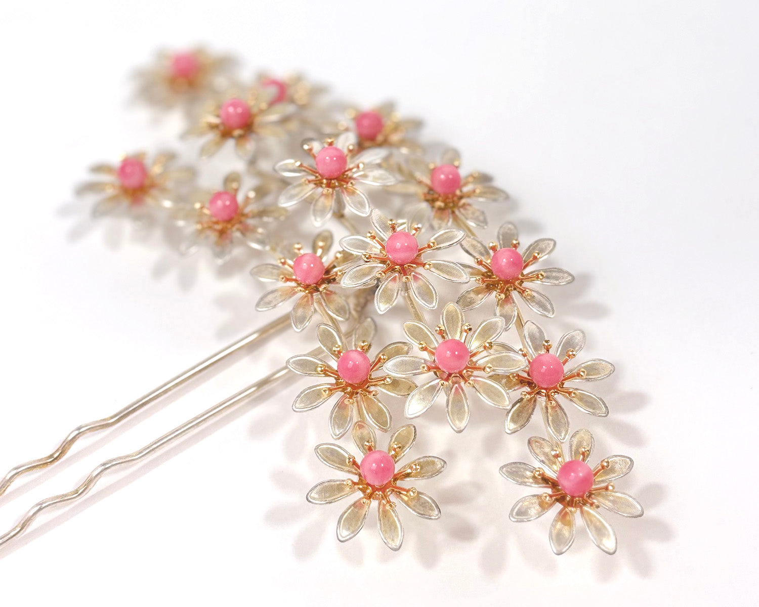 お花の中心には珊瑚風のピンクのビジューが可憐な印象です。