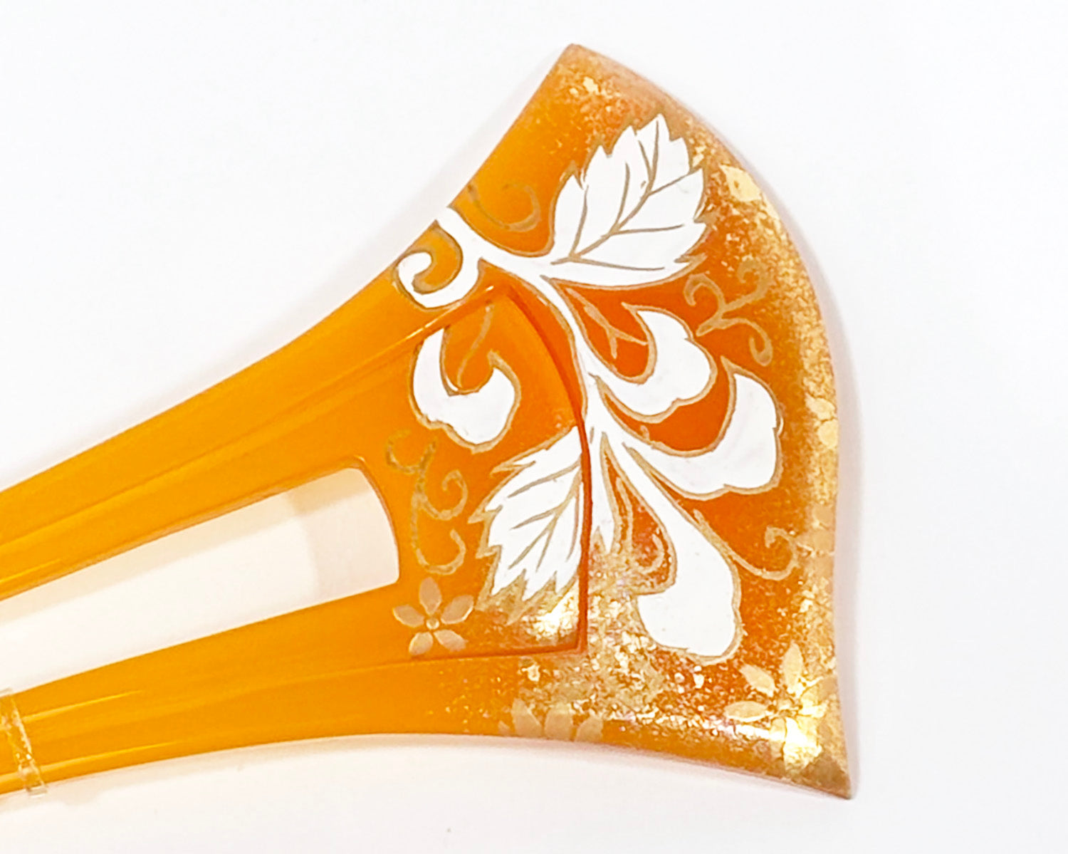 菊の蒔絵にパールビーズが付いた華やかなバチ型のかんざしです。