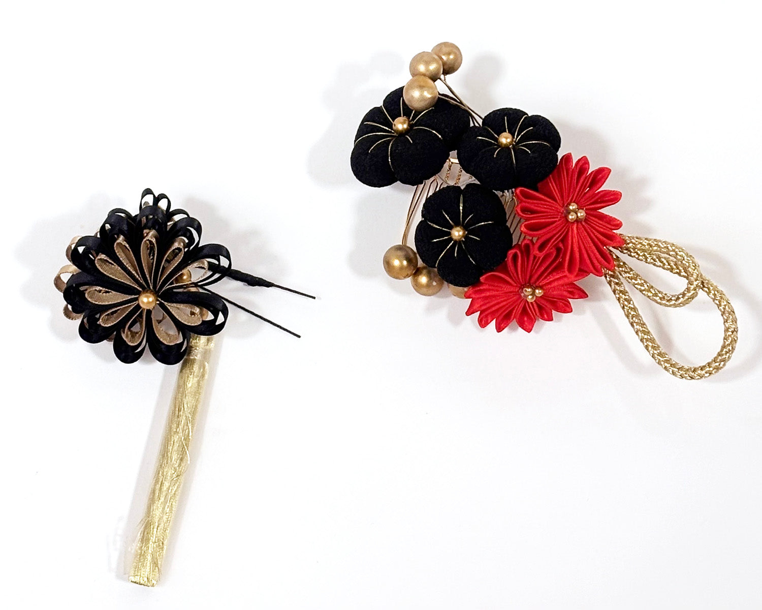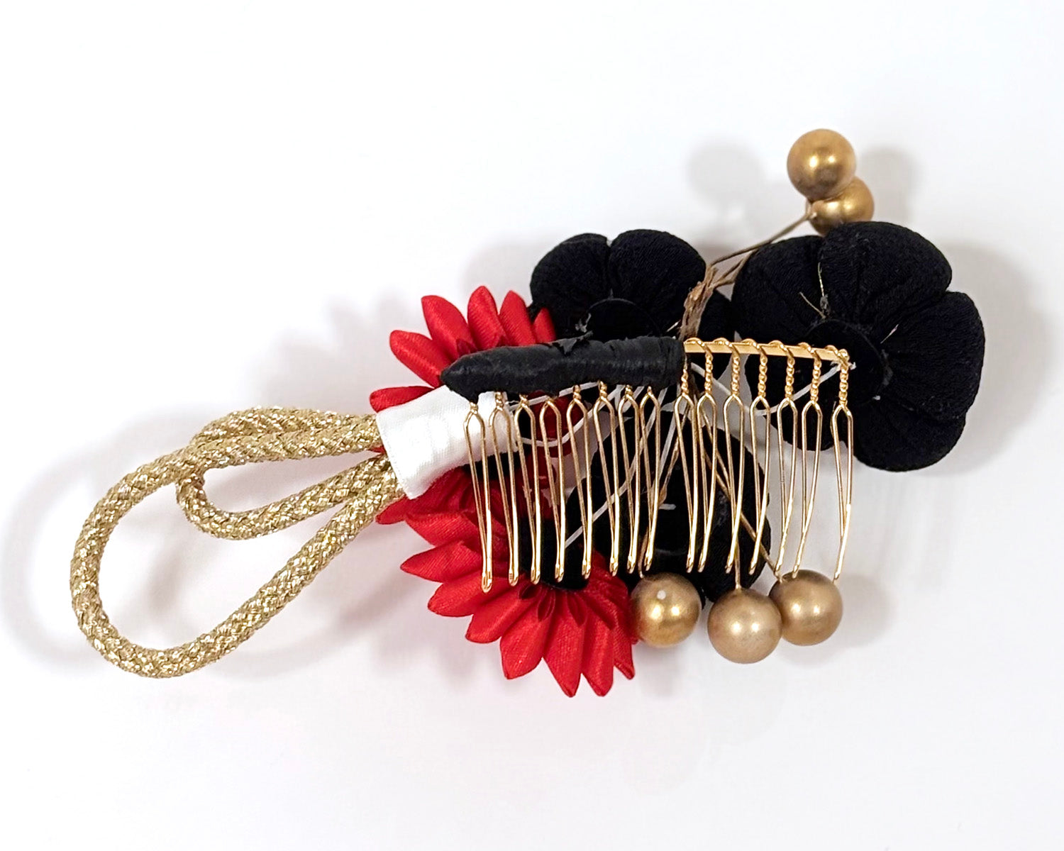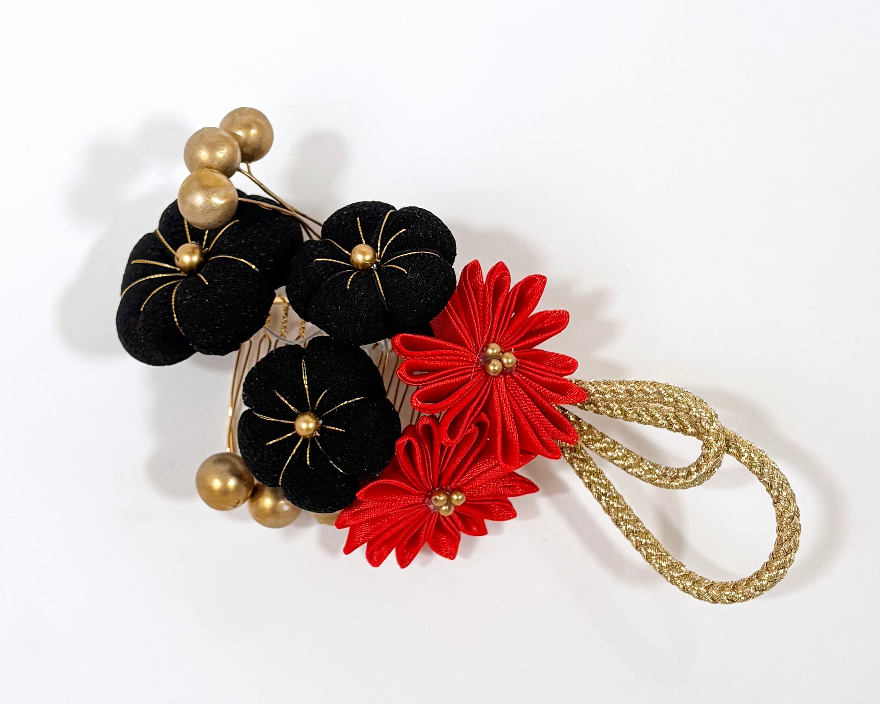 組紐付きの梅菊のコームと房付きのピンがセットになった髪飾りです。