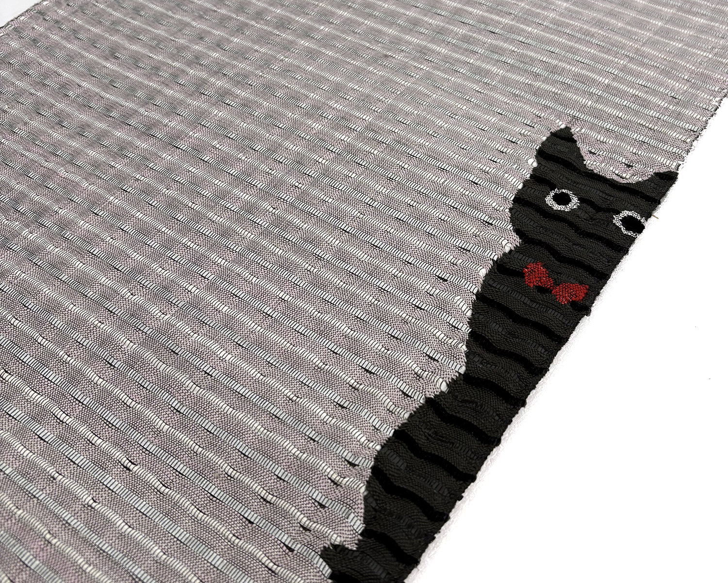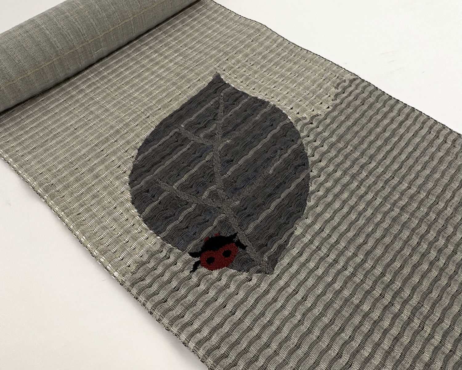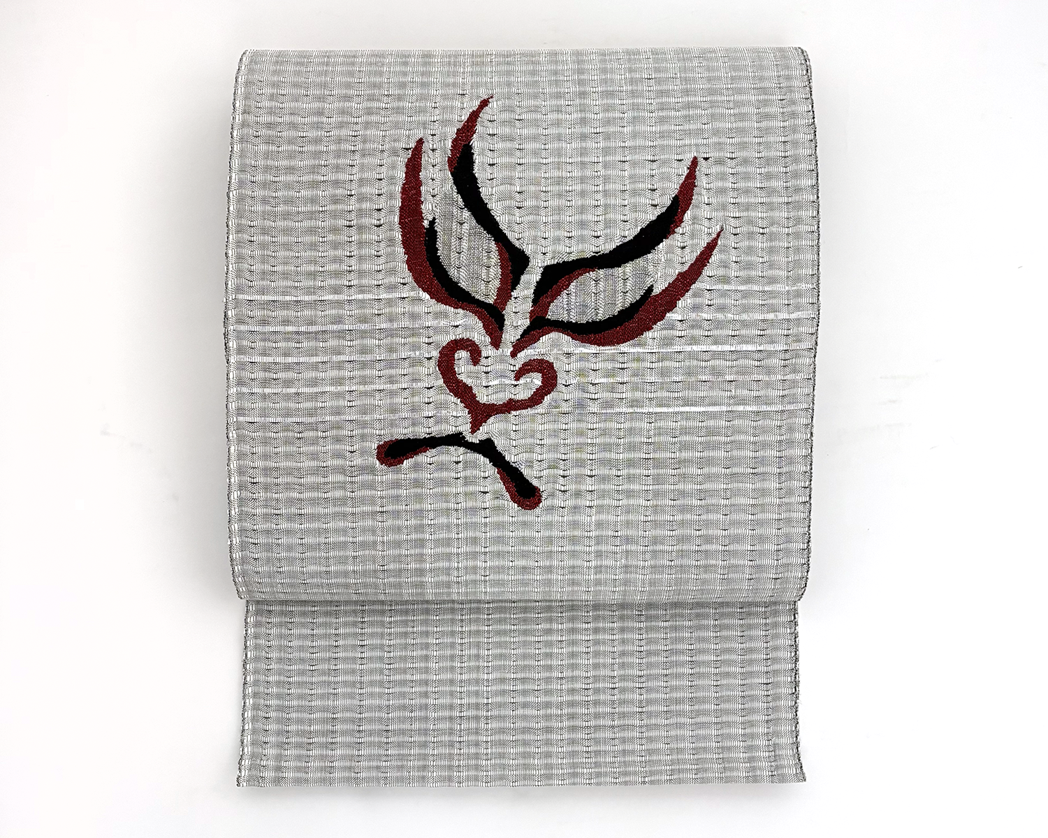 この帯は、縦糸に絹、緯糸に和紙を用いた「紙布」で織り上げられています。