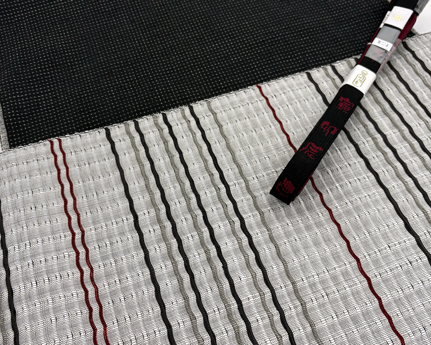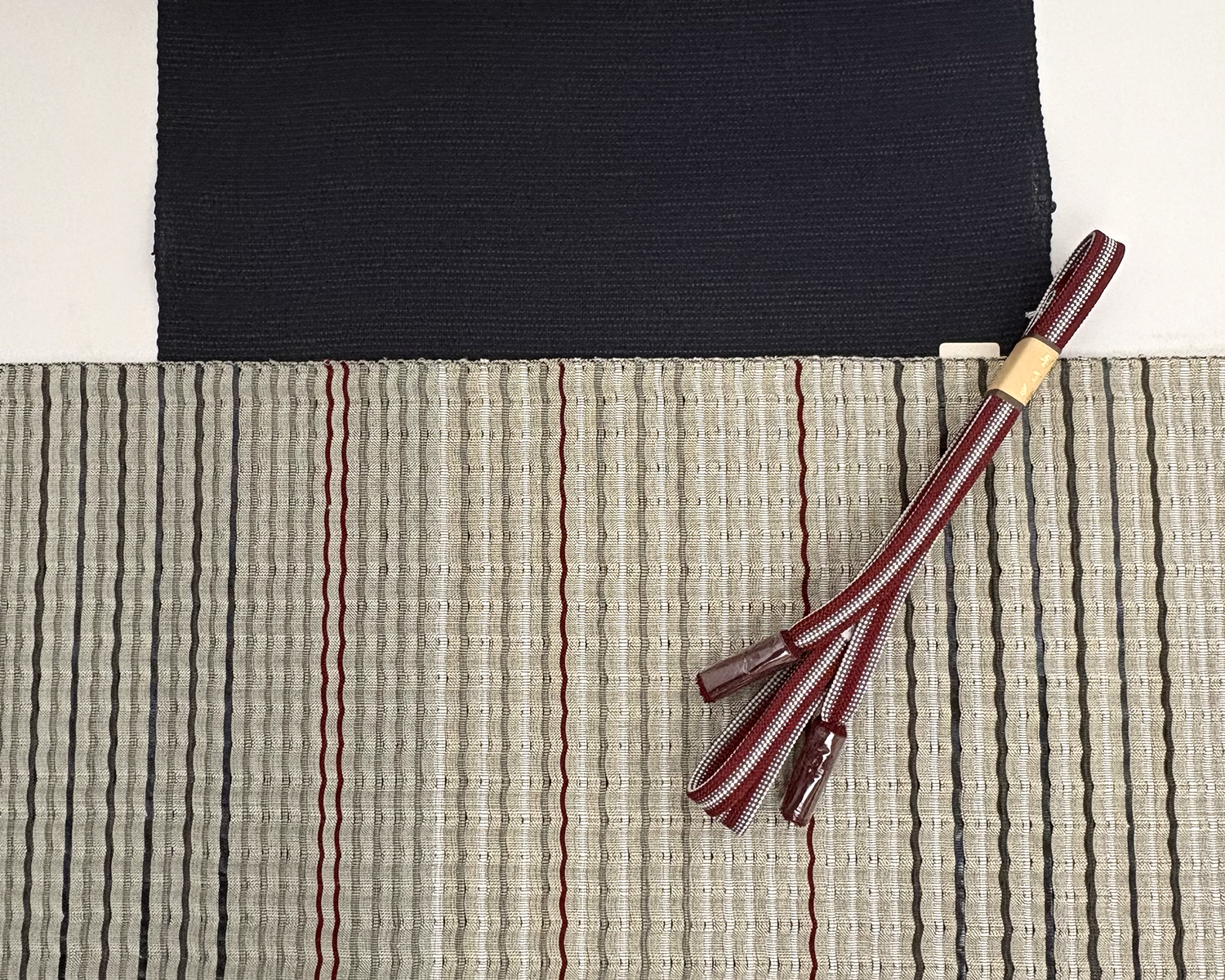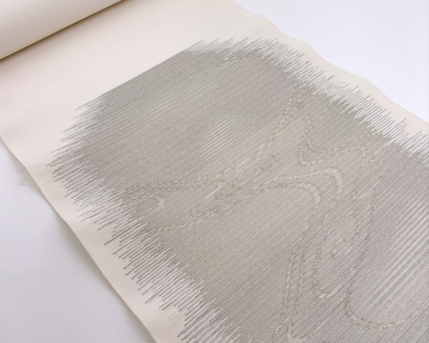 この帯は、縦糸に絹、緯糸に和紙を用いた「紙布」で織り上げられています。
