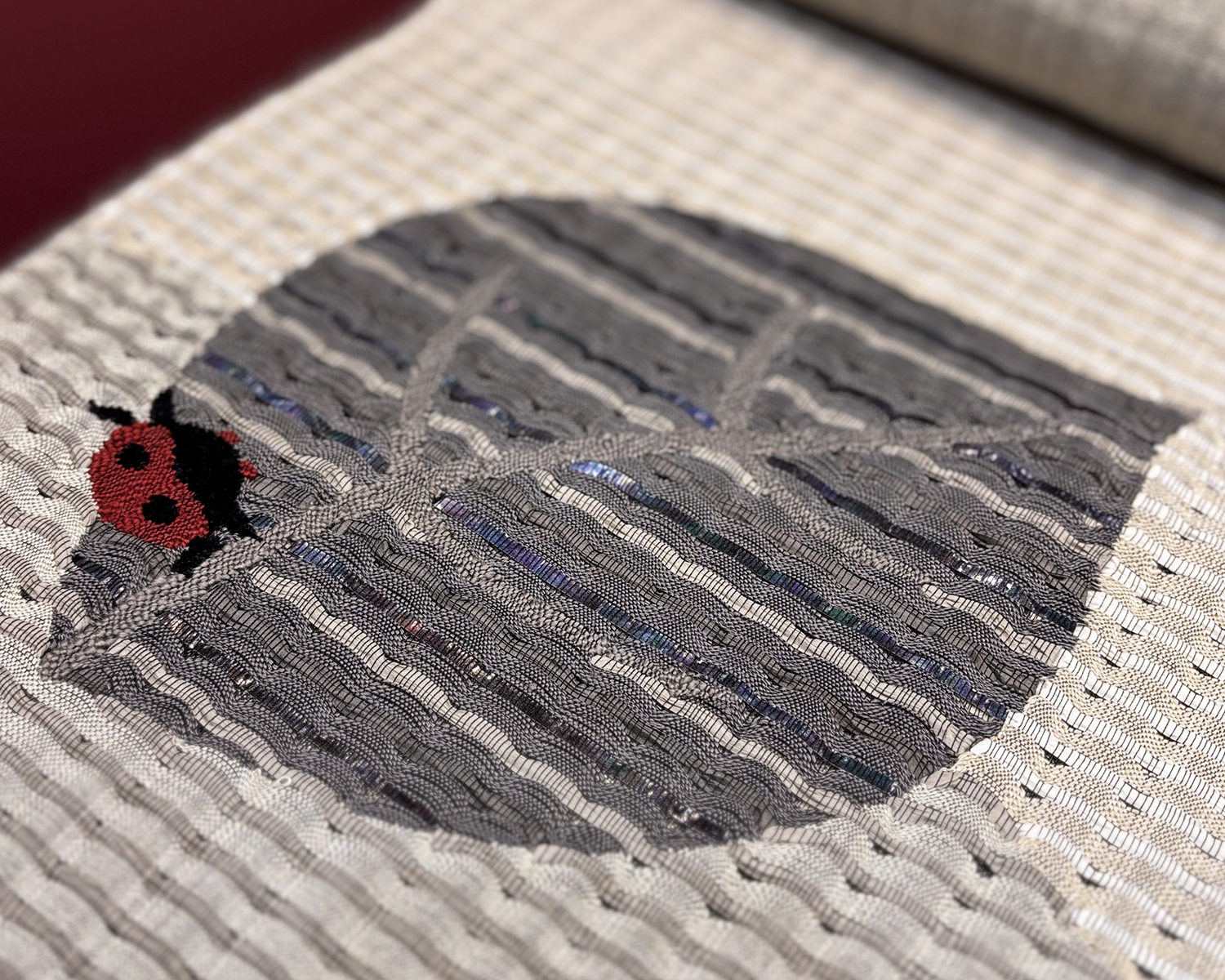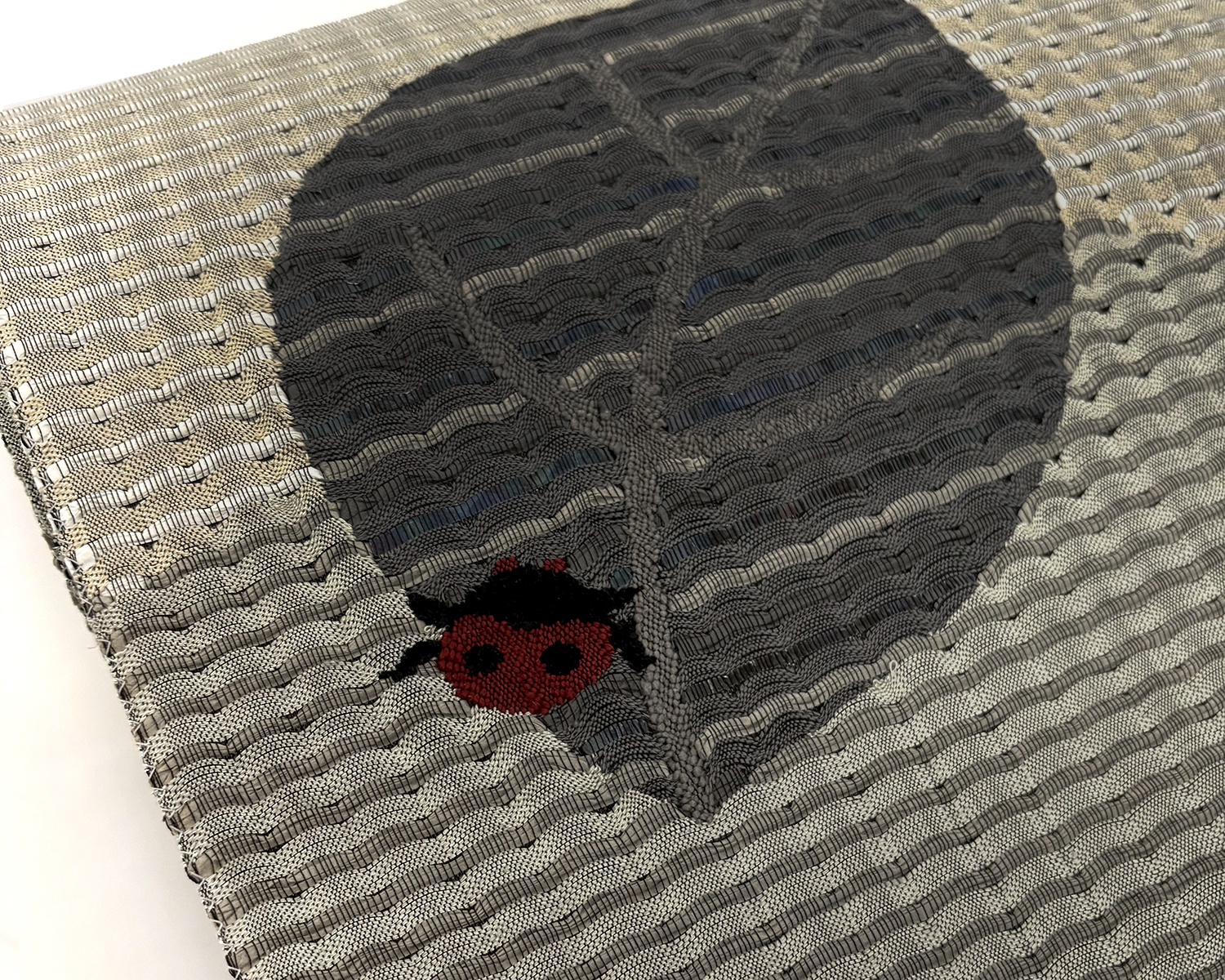 さらに、この帯の大きな葉の中にはでは和紙の緯糸の中に漆箔が織り込まれており、