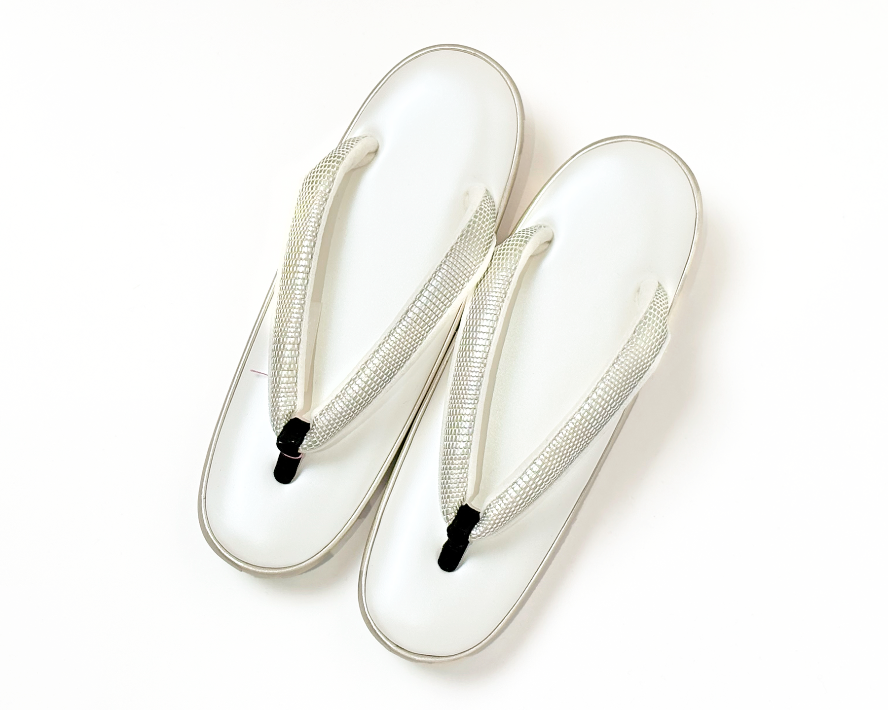 シルバーのリザードのように見える鼻緒の素材は、メタリックな箔を織り込んだ物。